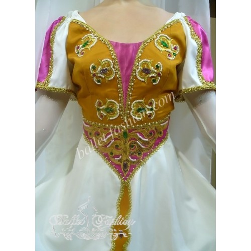 Professional ballet dress. Bodice is made of semi-stretch dense white fabric. There is a contrast insert on the bodice and the imitation of a belt of the same color. Complex sleeves are composed of short satin sleeves and long semi-stretch mesh fabric sleeves.