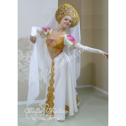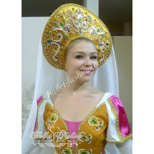 Long skirt is made of satin. Traditional Russian headpiece kokoshnik with light chiffon veil emphasizes the originality of the costume.
