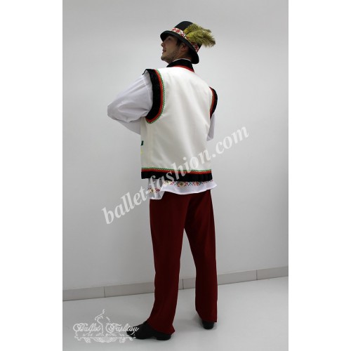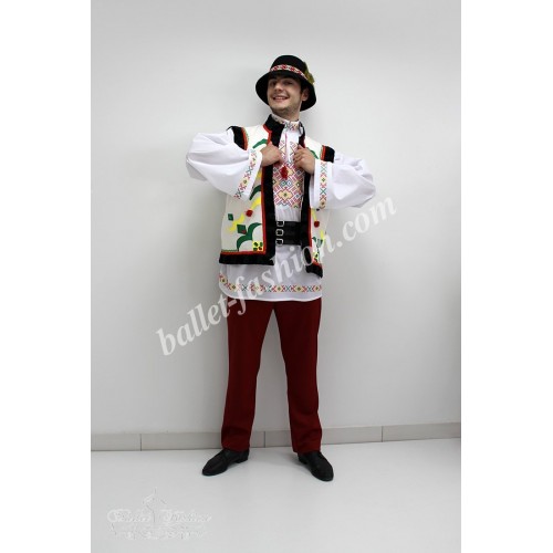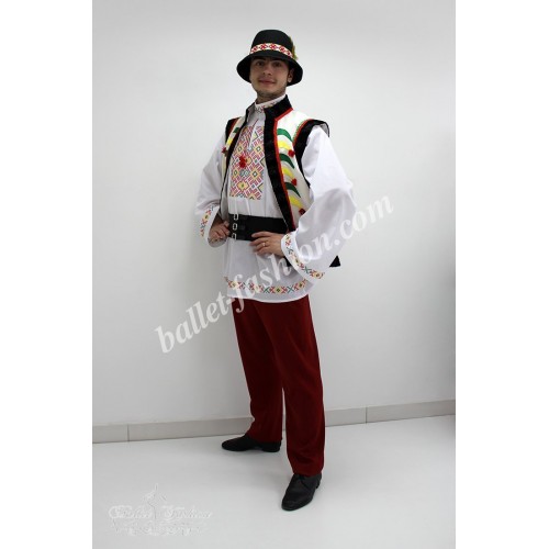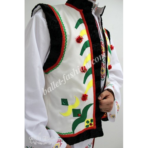 Embroidery on blouse is made on the special embroidering machine. Vest is decorated with appliques, pompomns, crystals, and two types of braid. Straight pants are typical for national dance.