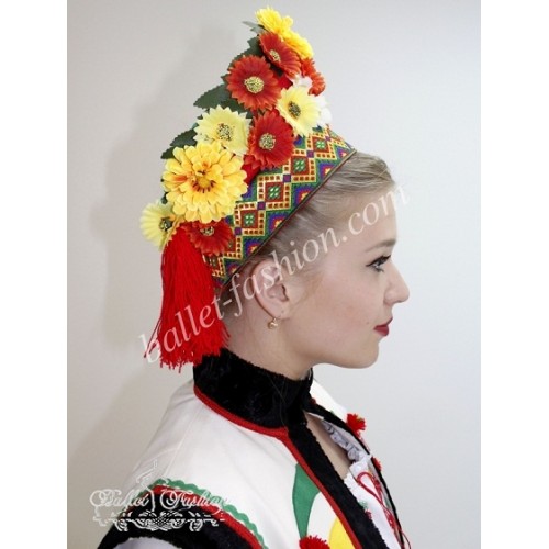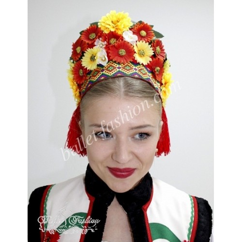Traditional Romanian headdress decorated with national braid,beautiful flowers and traditional red tassels.