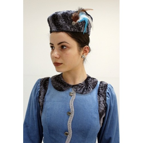 Beautiful headpiece is made of gray artificial caracul and is decorated with multticolored feathers and silver button.