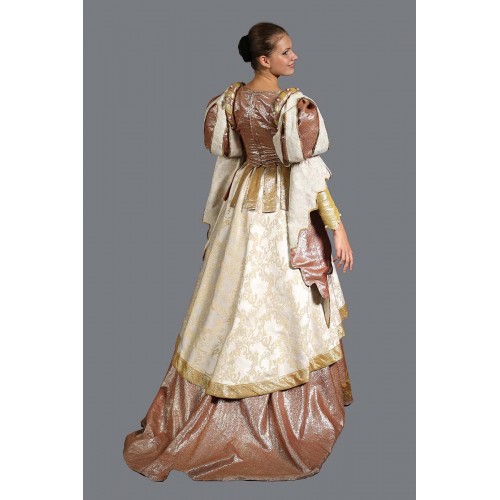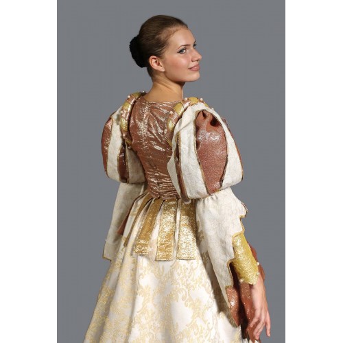 The bodice is made of the semi-stretched dense fabric. There are two rows of hooks for the comfortable adjustment and an inner cord to tighten the bodice at the chest level. There is a deep contrast insert on the chest that is richly decorated with appliques and pearls and crystals. Complex sleeves are also made of semi-stretched dense fabric and are decorated with gold braid and pearls.