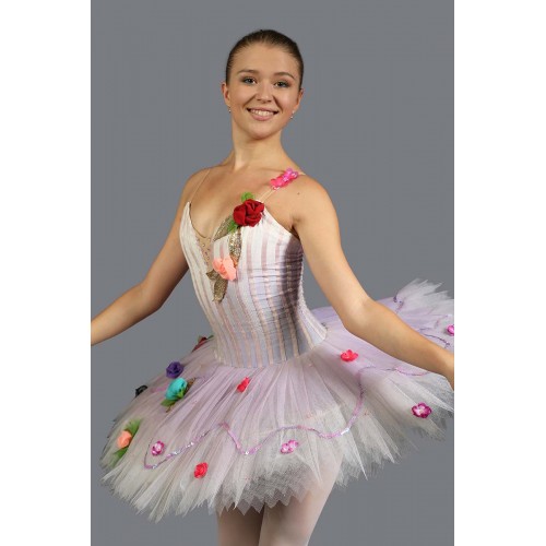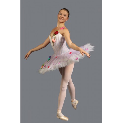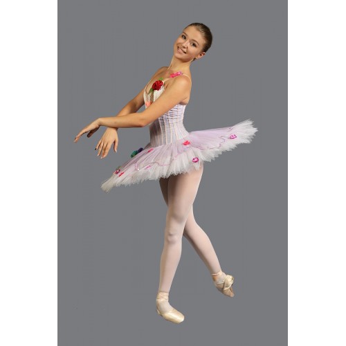 It is a professional stage costume, which is carried out on the basis of the professional basic tutu. The bodice is made of the semi-stretched dense fabric. There is a nude inset on the chest. Straps are nude too. There are two rows of hooks for the comfortable adjustment and an inner cord to tighten the bodice at the chest level.