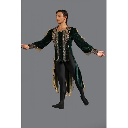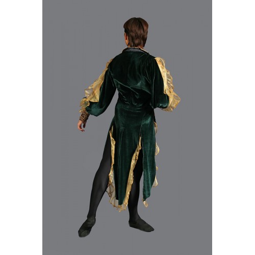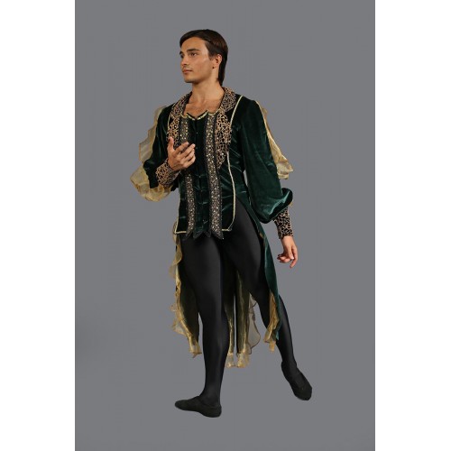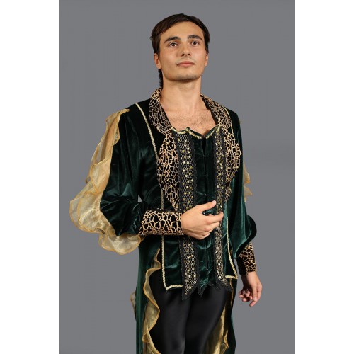Tunic with long tails is made of velvet with long sleeves and organza frills. There are decorative gold net inserts in front and on cuffs. Tunic is decorated with two types of braid and sequins.