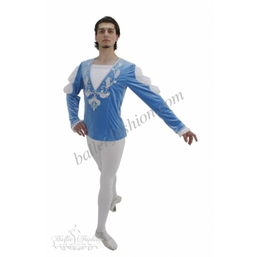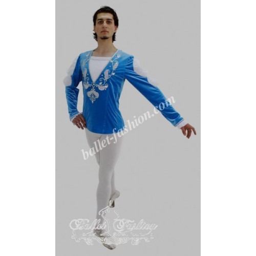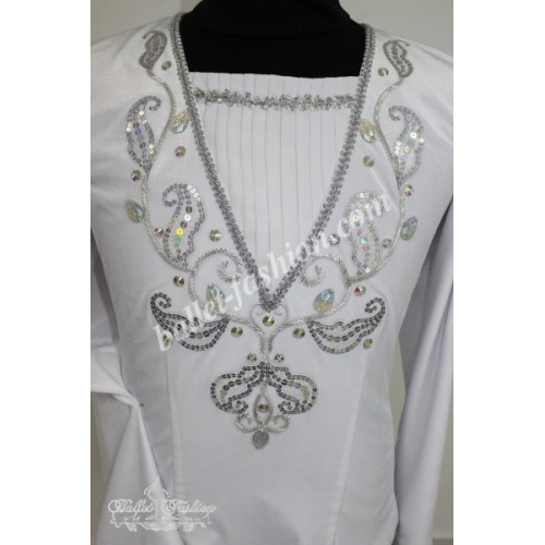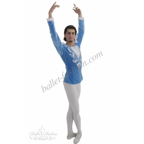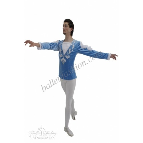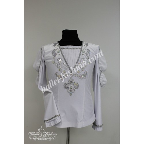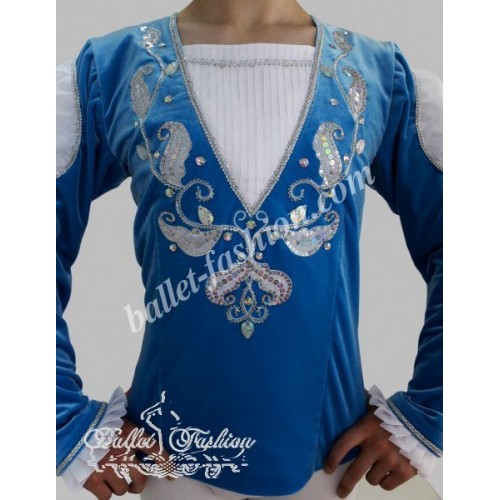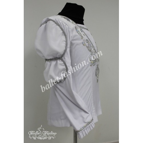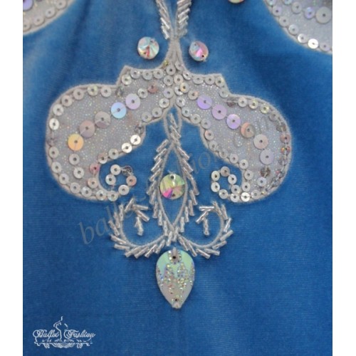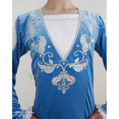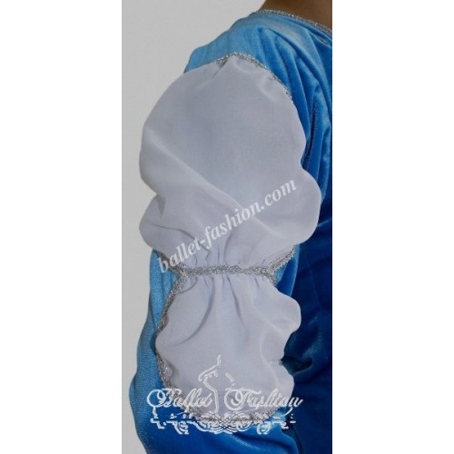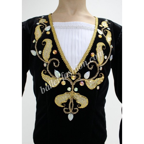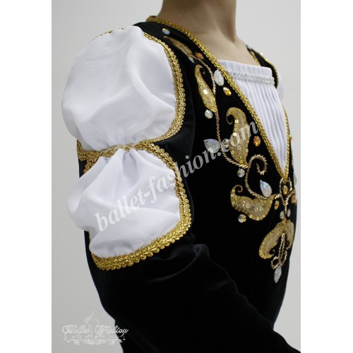 It is a professional stage costume, which is made of the stretch velvet fabric. Collar, buffs on sleeves and cuffs are made of white crepe-chiffon. Costume is richly decorated with braid, appliqués and crystals.