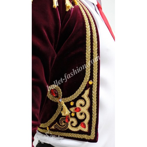 The tunic is decorated with a dense golden braid. It is also embroidered with golden and red sparkles and crystals of different sizes.