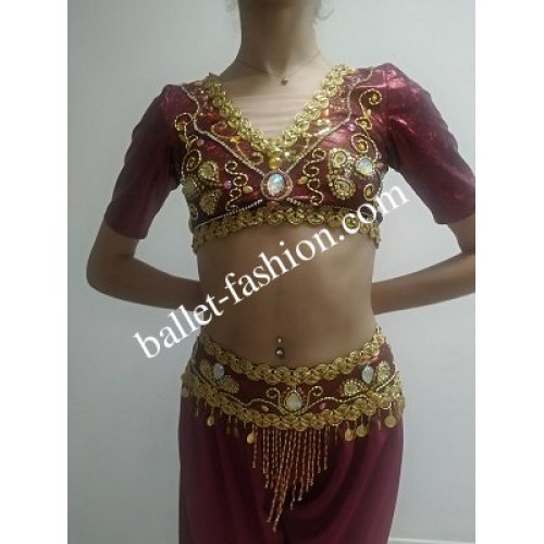 The costume is carried out in accordance with the oriental traditions with characteristic décor elements.The elastic bodice with sleeves is made of holographic supplex and finishes under the breast.