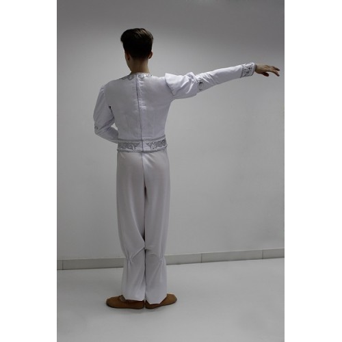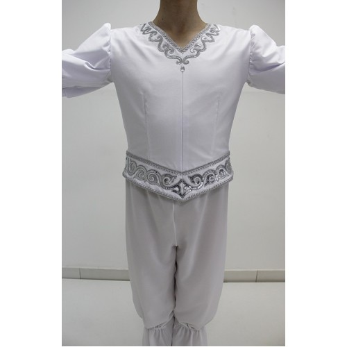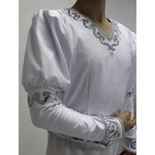 Professional ballet tunic is made of supplex fabric with cotton lining. Upper part of sleeve is puffed. Tunic fastens on the back on hooks. It is beautifully decorated in oriental style with silver appliques, sequins, braid and crystal.