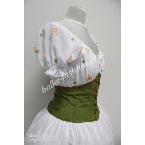 A complex bodice is made of the semi-stretched fabric with a decorative lacing in front; it passes into chiffon light blouse with puffed sleeves on the elastic band. Blouse is decorated with beautiful flowers matching the color of the bodice.