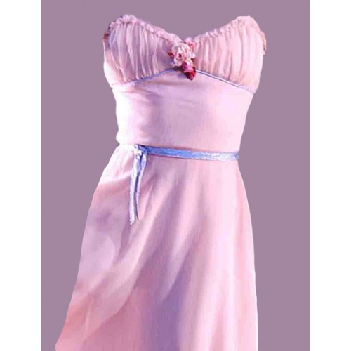 The skirt is made of a light chiffon fabric. This simple but original dress is decorated with a beautiful flower in front and satin braid on the waist line.