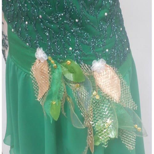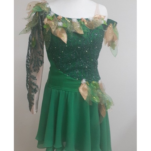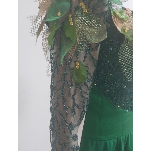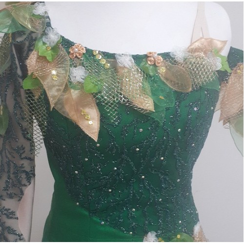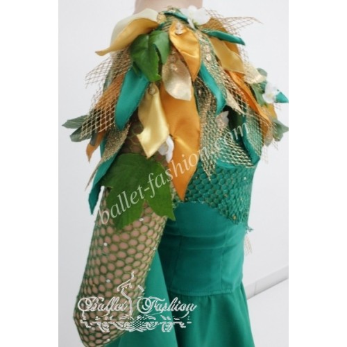 Costume is richly decorated with leaves made of various fabrics, flowers and seqins.