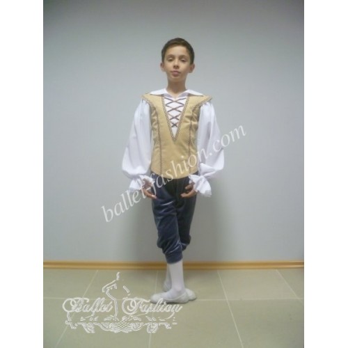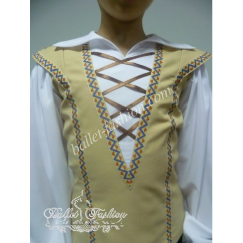 The costume is made of semi-stretch fabric as a simple vest in peasant style with lacing in the front. The sleeves and collar are made of white crepe-chiffon.