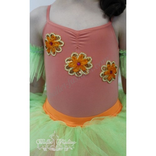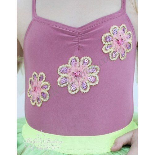 Camisole leotard is made of supplex and is decorated with flowers made of braid,sequins and crystals.