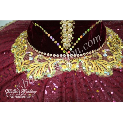 The overlay of the tutu is made of guipure fabric. Costume is richly decorated with gold braid, appliques, sequins and crystals.