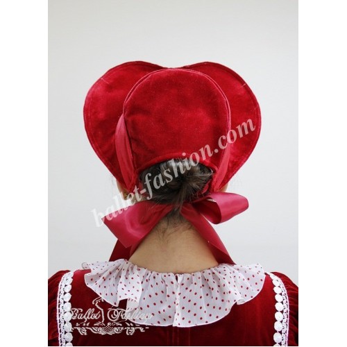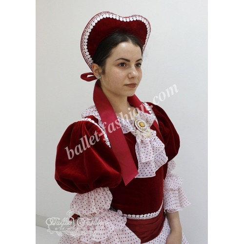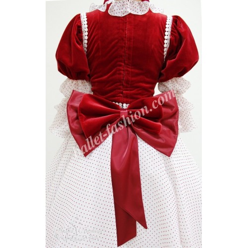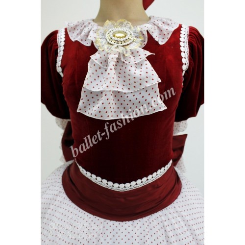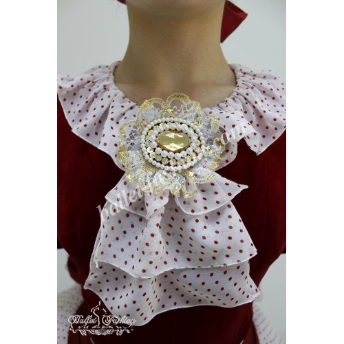 Bodice with puffed sleeves is made of velvet and fastens on the back on hooks. Collar and the lower part of sleeves are made of polkadot chiffon. There is the imitation of a belt made of satin with big bow on the back. Bodice is decorated with white braid and brooch. Beautiful brooch in victorian style is decorated with sequins, beads, pearls, lace and crystal.